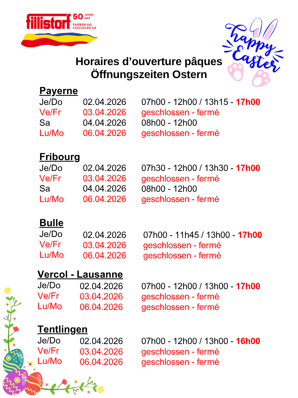 Öffnungszeiten während der Osterwoche